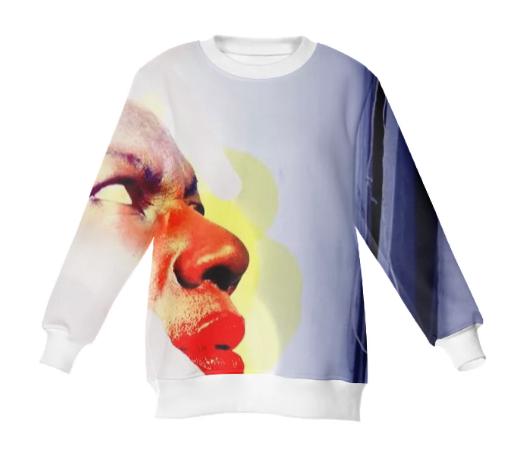 Bulky fitting neoprene sweatshirt with solid black or white neck cuff and waistband ribbing.