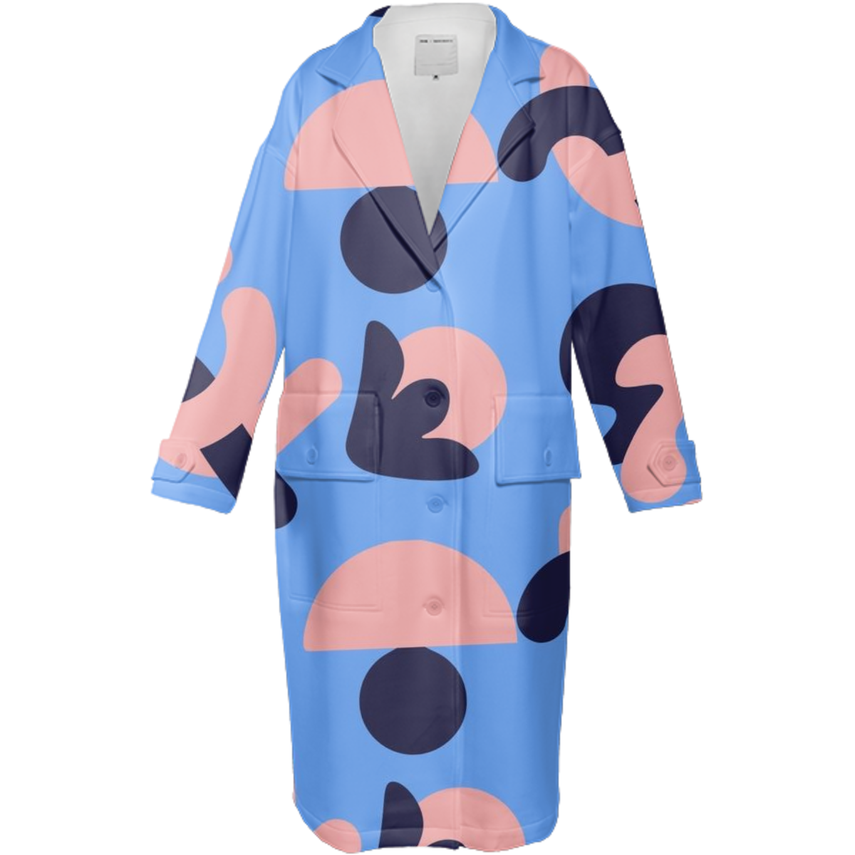 Loose fitting knee/calf length neoprene trench coat with plastic buttons up the front two front welt flap pockets and decorative buttoned strap details at the cuffs.