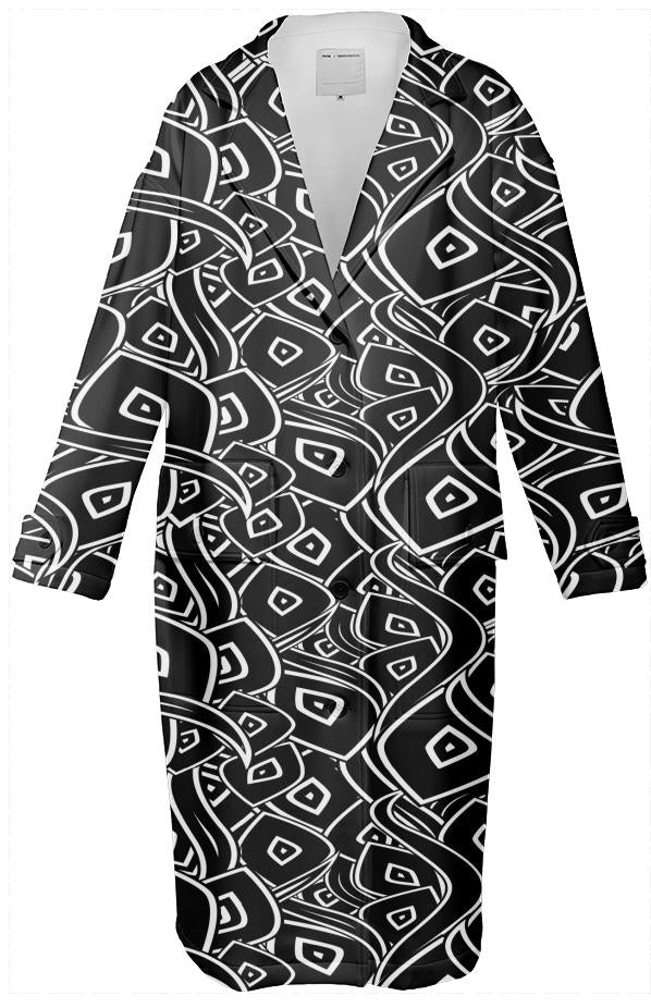 Loose fitting knee/calf length neoprene trench coat with plastic buttons up the front two front welt flap pockets and decorative buttoned strap details at the cuffs.