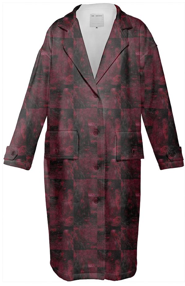 Loose fitting knee/calf length neoprene trench coat with plastic buttons up the front two front welt flap pockets and decorative buttoned strap details at the cuffs.