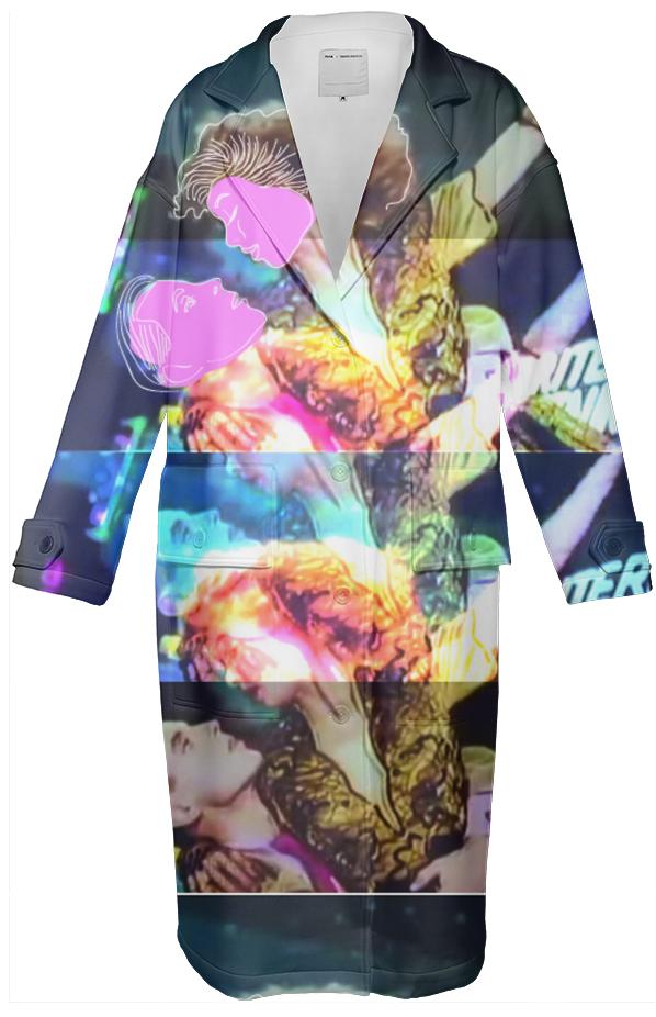 Loose fitting knee/calf length neoprene trench coat with plastic buttons up the front two front welt flap pockets and decorative buttoned strap details at the cuffs.