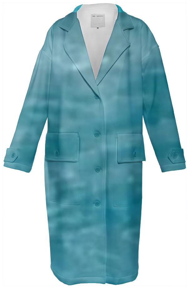 Loose fitting knee/calf length neoprene trench coat with plastic buttons up the front two front welt flap pockets and decorative buttoned strap details at the cuffs.