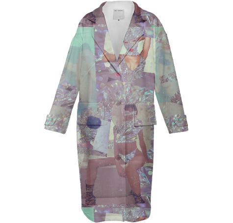 Loose fitting knee/calf length neoprene trench coat with plastic buttons up the front two front welt flap pockets and decorative buttoned strap details at the cuffs.