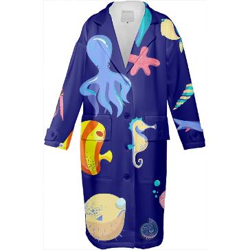 Loose fitting knee/calf length neoprene trench coat with plastic buttons up the front two front welt flap pockets and decorative buttoned strap details at the cuffs.