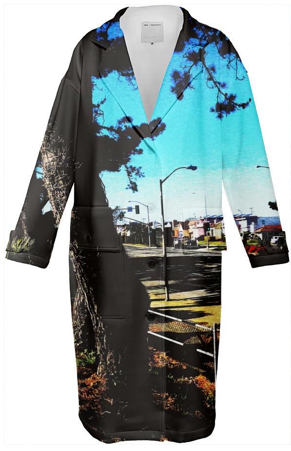 Loose fitting knee/calf length neoprene trench coat with plastic buttons up the front two front welt flap pockets and decorative buttoned strap details at the cuffs.