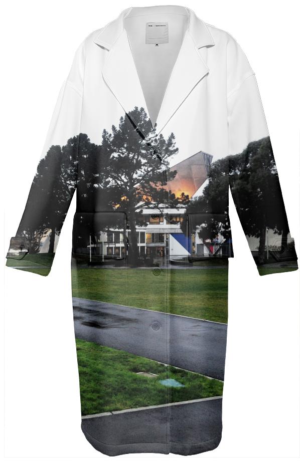 Loose fitting knee/calf length neoprene trench coat with plastic buttons up the front two front welt flap pockets and decorative buttoned strap details at the cuffs.