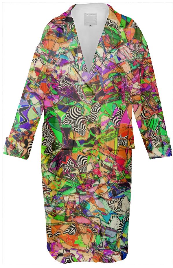 Loose fitting knee/calf length neoprene trench coat with plastic buttons up the front two front welt flap pockets and decorative buttoned strap details at the cuffs.