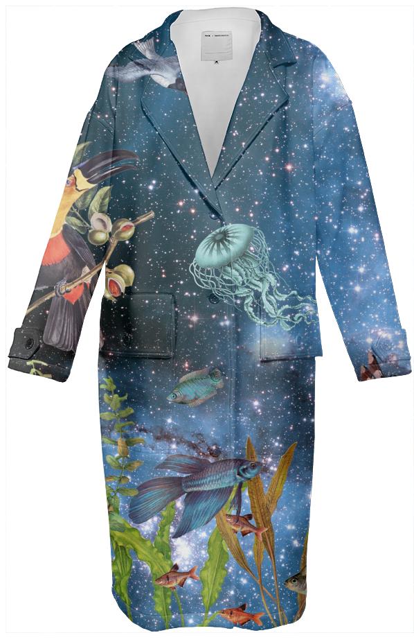 Loose fitting knee/calf length neoprene trench coat with plastic buttons up the front two front welt flap pockets and decorative buttoned strap details at the cuffs.