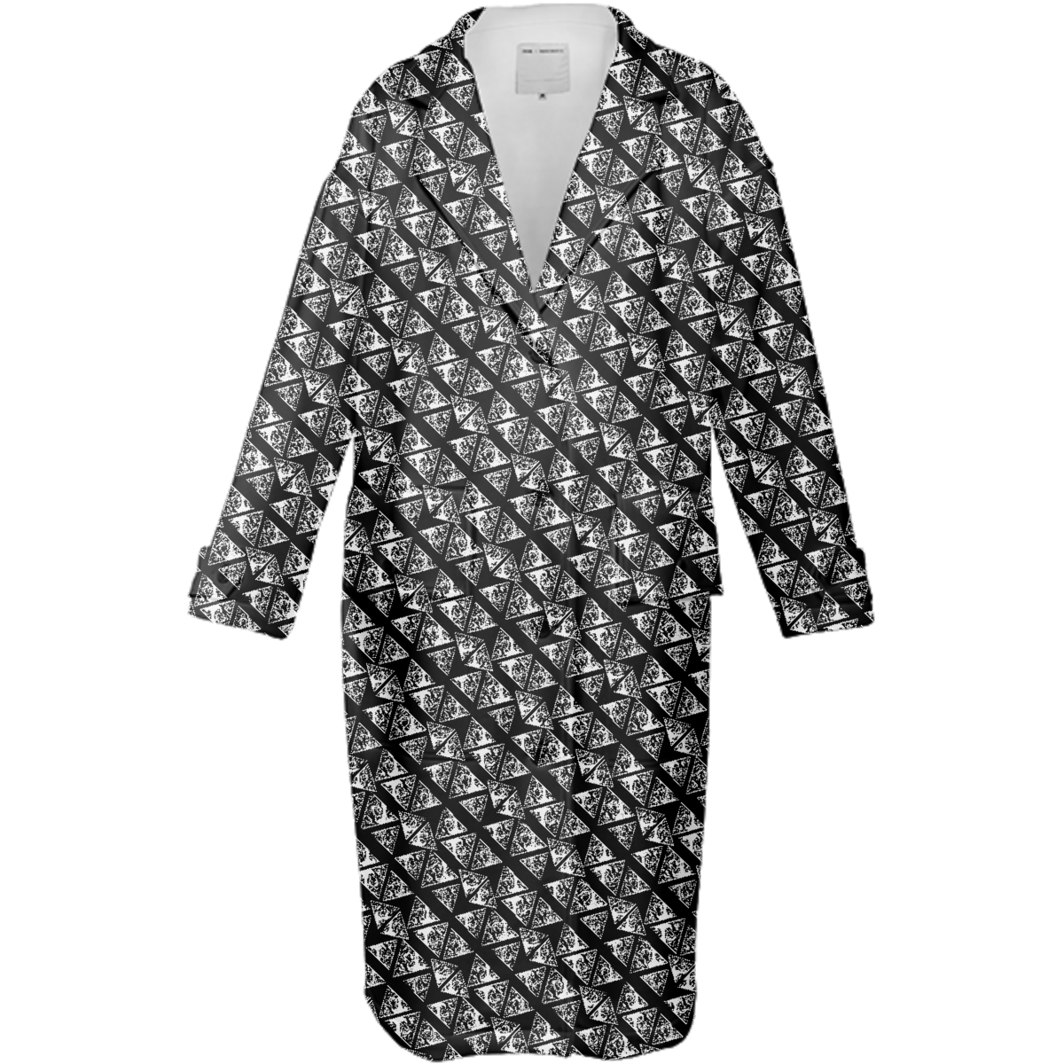 Loose fitting knee/calf length neoprene trench coat with plastic buttons up the front two front welt flap pockets and decorative buttoned strap details at the cuffs.