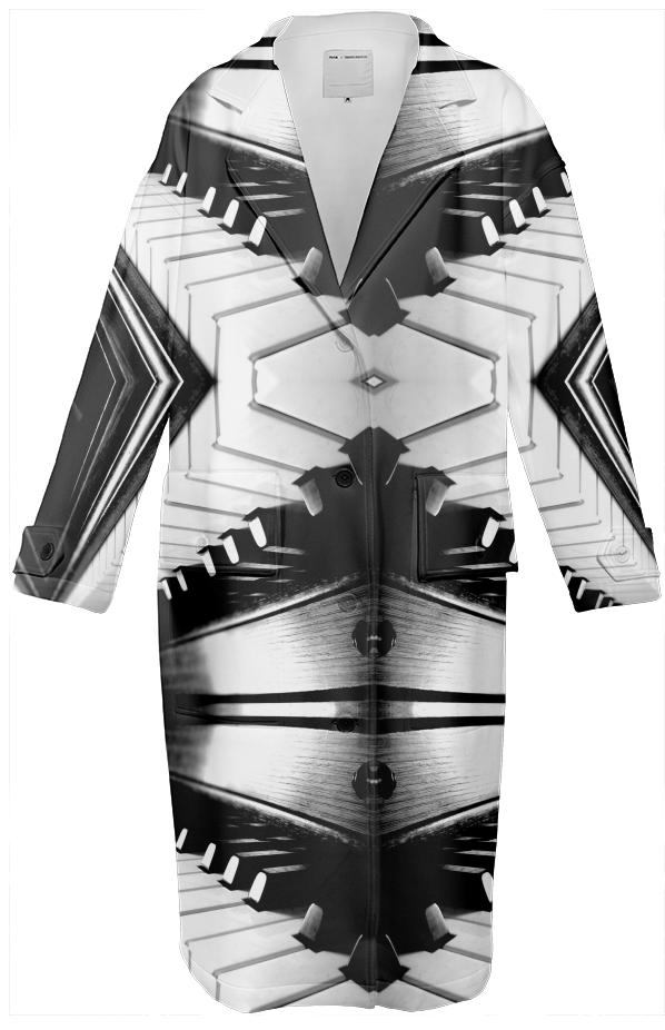 Loose fitting knee/calf length neoprene trench coat with plastic buttons up the front two front welt flap pockets and decorative buttoned strap details at the cuffs.