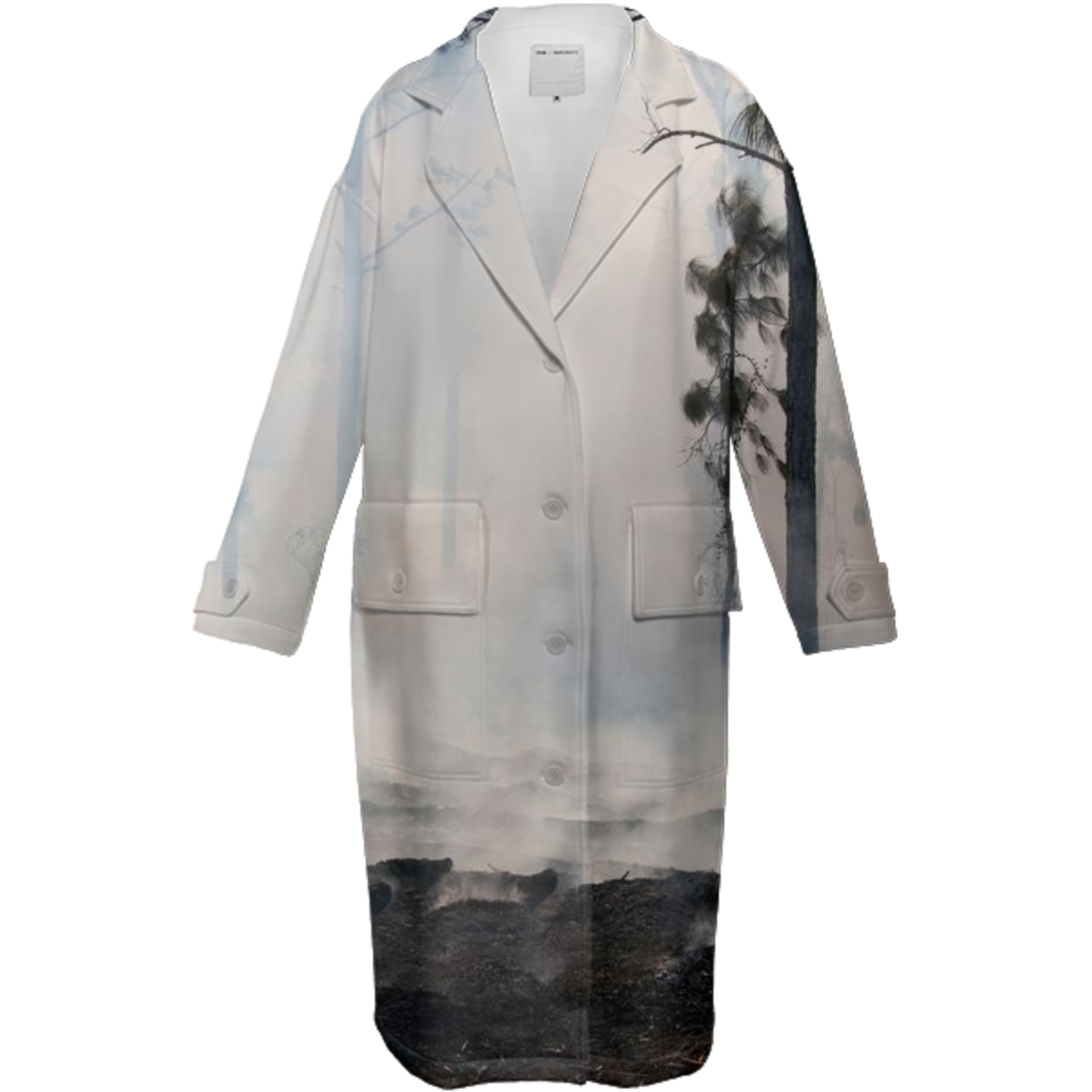 Loose fitting knee/calf length neoprene trench coat with plastic buttons up the front two front welt flap pockets and decorative buttoned strap details at the cuffs.
