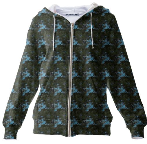 Slim fitting zip up hoodie with front kangaroo pockets metal zipper and drawstring hood.