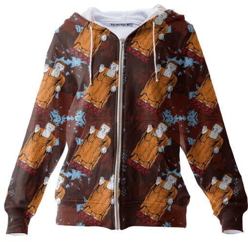 Slim fitting zip up hoodie with front kangaroo pockets metal zipper and drawstring hood.