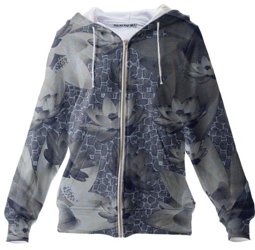 Slim fitting zip up hoodie with front kangaroo pockets metal zipper and drawstring hood.