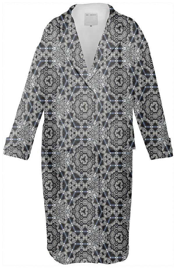 Loose fitting knee/calf length neoprene trench coat with plastic buttons up the front two front welt flap pockets and decorative buttoned strap details at the cuffs.