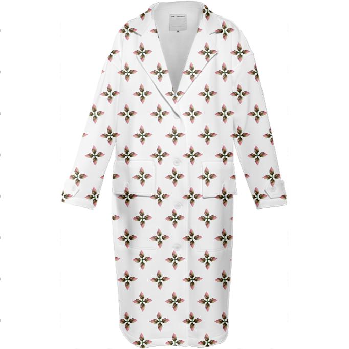 Loose fitting knee/calf length neoprene trench coat with plastic buttons up the front two front welt flap pockets and decorative buttoned strap details at the cuffs.