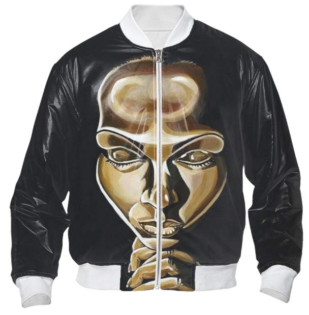 Light weight bombr jacket with your choice of white or black ribbing slight padding zip up front and side pockets. The inside is adorned with PAOM straps for swinging over your shoulders so you dont have to hold it.