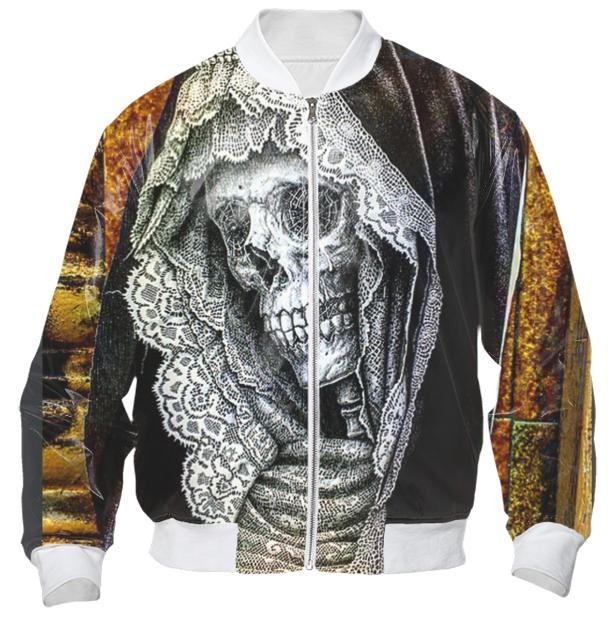 Light weight bombr jacket with your choice of white or black ribbing slight padding zip up front and side pockets. The inside is adorned with PAOM straps for swinging over your shoulders so you dont have to hold it.