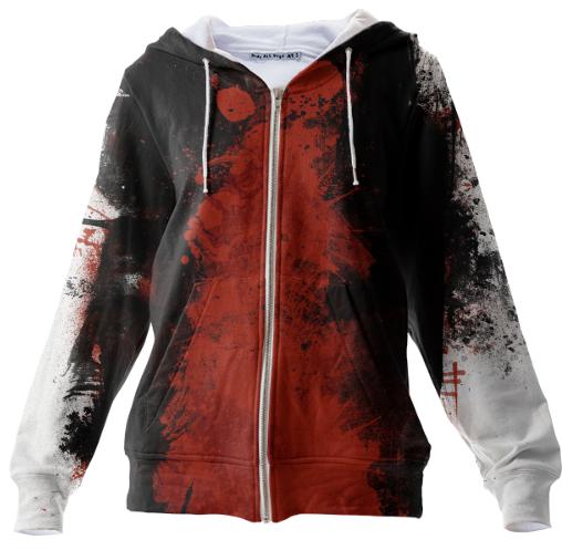 Slim fitting zip up hoodie with front kangaroo pockets metal zipper and drawstring hood.