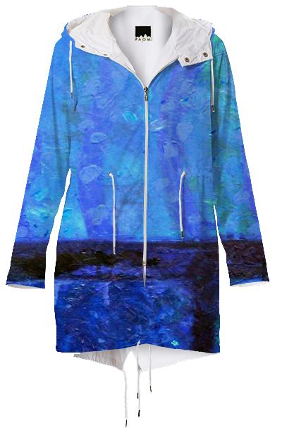 Light weight water resistant raincoat meant for easy layering in all sorts of rainy climates. Features waist & bottom hem drawstrings for definition and a double snap hood to protect against wind & rain.