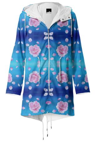 Light weight water resistant raincoat meant for easy layering in all sorts of rainy climates. Features waist & bottom hem drawstrings for definition and a double snap hood to protect against wind & rain.