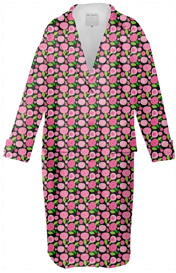 Loose fitting knee/calf length neoprene trench coat with plastic buttons up the front two front welt flap pockets and decorative buttoned strap details at the cuffs.
