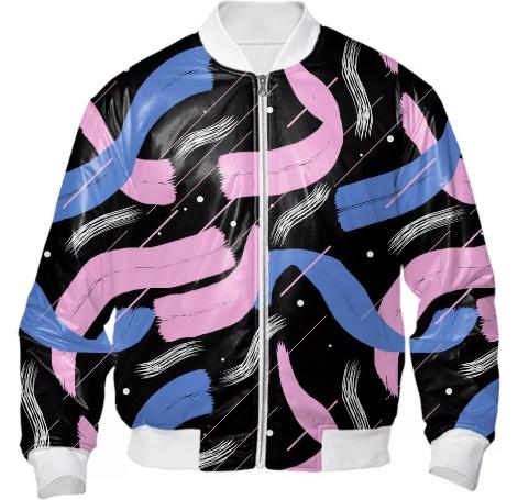 Light weight bombr jacket with your choice of white or black ribbing slight padding zip up front and side pockets. The inside is adorned with PAOM straps for swinging over your shoulders so you dont have to hold it.
