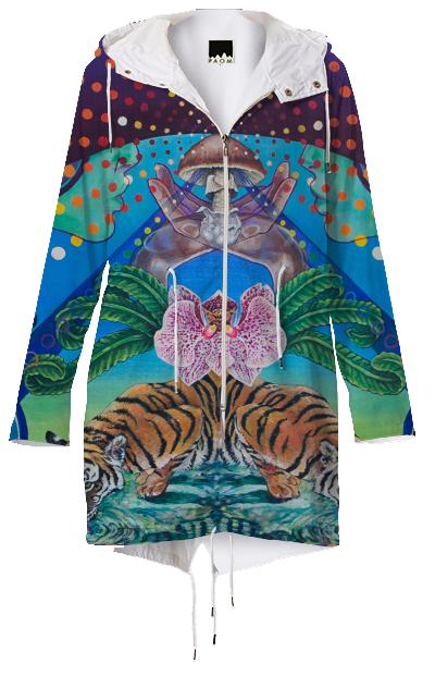 Light weight water resistant raincoat meant for easy layering in all sorts of rainy climates. Features waist & bottom hem drawstrings for definition and a double snap hood to protect against wind & rain.
