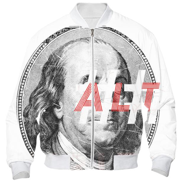 Light weight bombr jacket with your choice of white or black ribbing slight padding zip up front and side pockets. The inside is adorned with PAOM straps for swinging over your shoulders so you dont have to hold it.