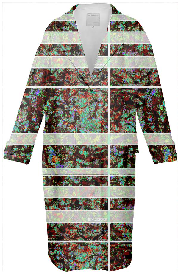 Loose fitting knee/calf length neoprene trench coat with plastic buttons up the front two front welt flap pockets and decorative buttoned strap details at the cuffs.