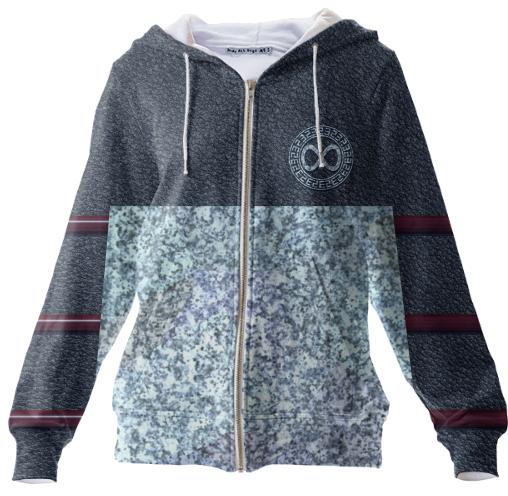 Slim fitting zip up hoodie with front kangaroo pockets metal zipper and drawstring hood.