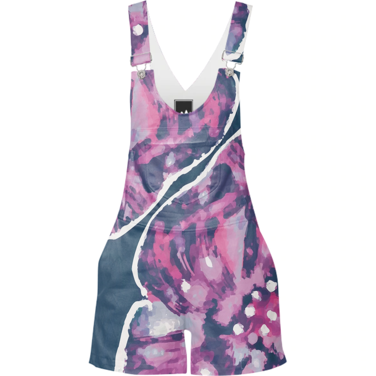 Short relaxed fit overalls with pockets two at the hips two on the back and one on the front bib. Straps are adjustable.
