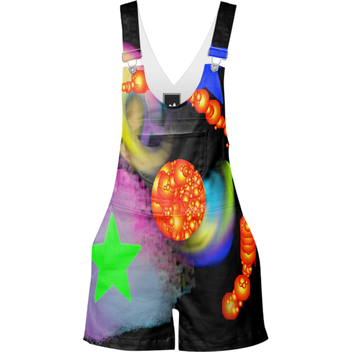 Short relaxed fit overalls with pockets two at the hips two on the back and one on the front bib. Straps are adjustable.