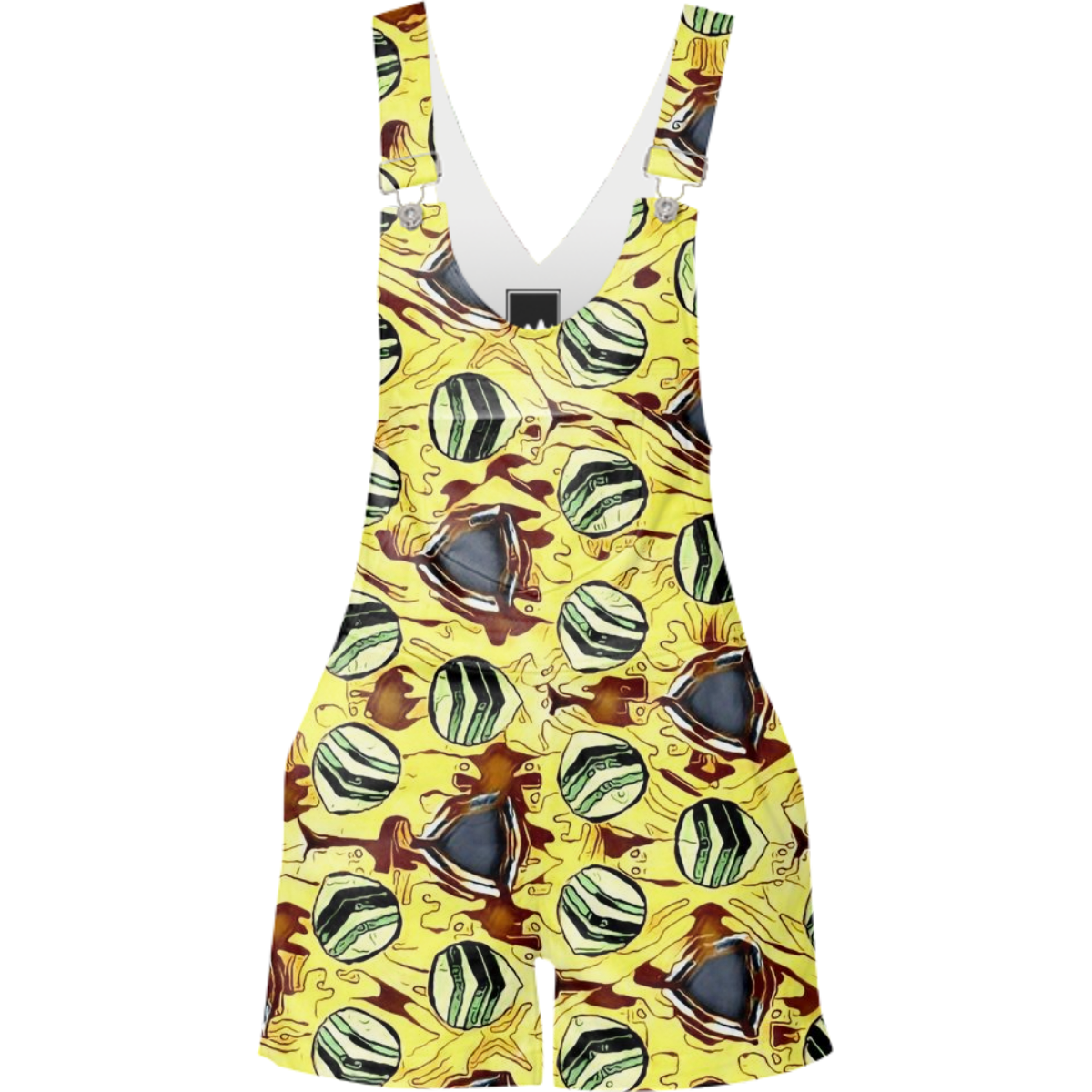 Short relaxed fit overalls with pockets two at the hips two on the back and one on the front bib. Straps are adjustable.