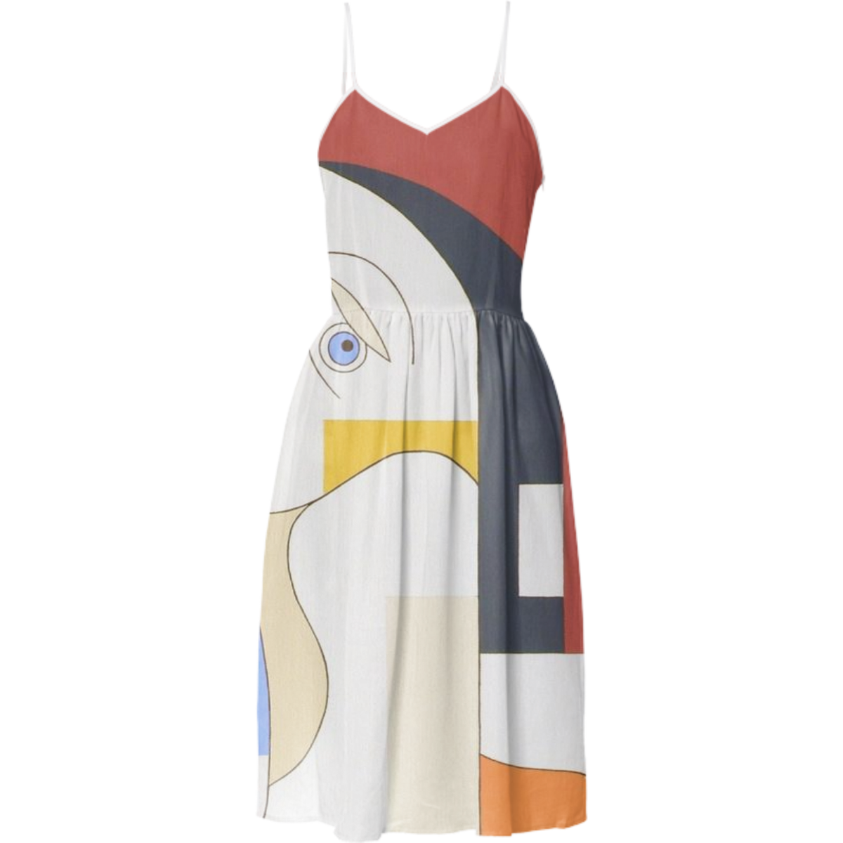 Knee length v-neckline dress with adjustable spaghetti straps shirred waist and invisible side seam zipper.