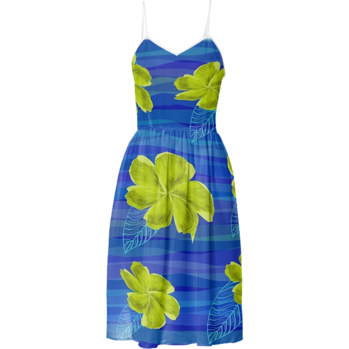 Knee length v-neckline dress with adjustable spaghetti straps shirred waist and invisible side seam zipper.