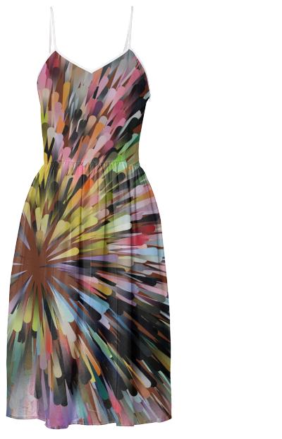 Knee length v-neckline dress with adjustable spaghetti straps shirred waist and invisible side seam zipper.