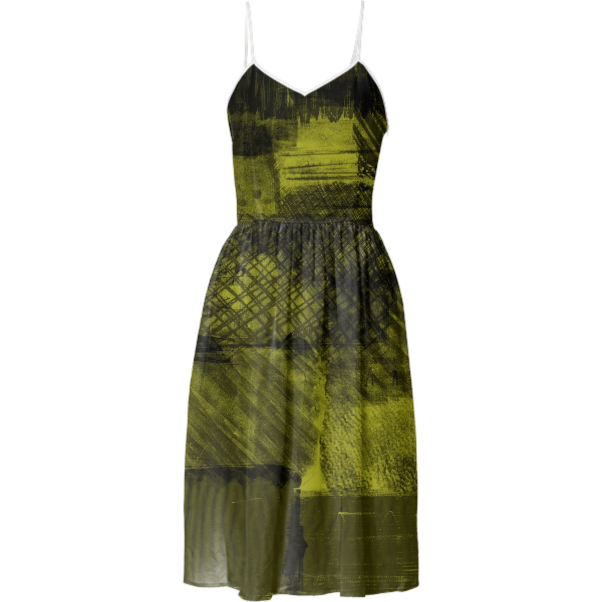 Knee length v-neckline dress with adjustable spaghetti straps shirred waist and invisible side seam zipper.