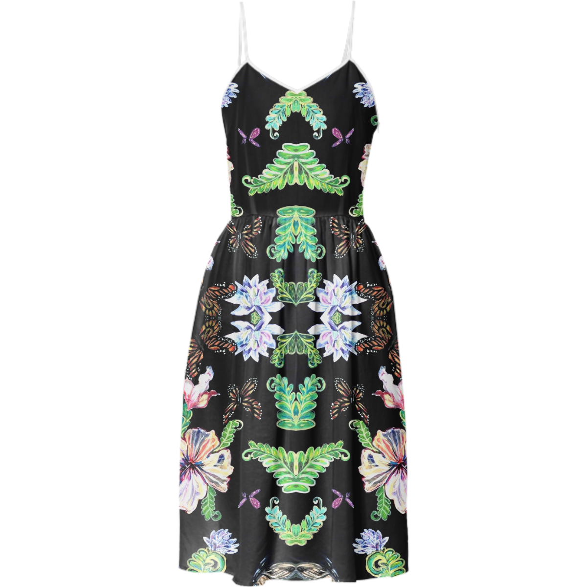 Knee length v-neckline dress with adjustable spaghetti straps shirred waist and invisible side seam zipper.