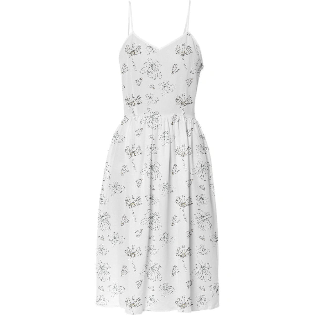 Knee length v-neckline dress with adjustable spaghetti straps shirred waist and invisible side seam zipper.