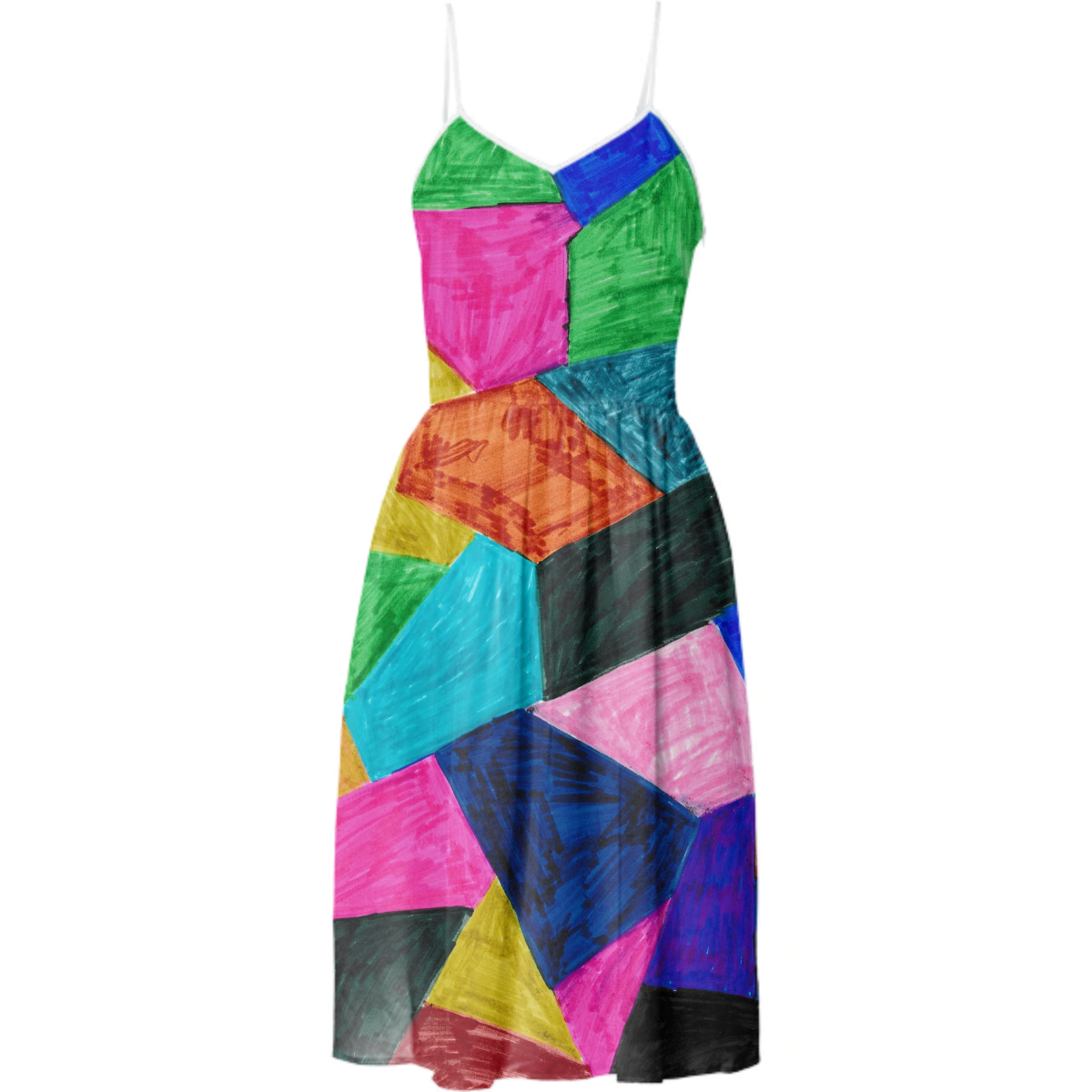 Knee length v-neckline dress with adjustable spaghetti straps shirred waist and invisible side seam zipper.