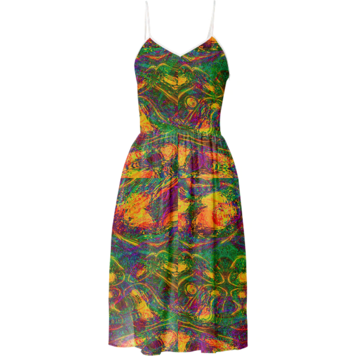 Knee length v-neckline dress with adjustable spaghetti straps shirred waist and invisible side seam zipper.