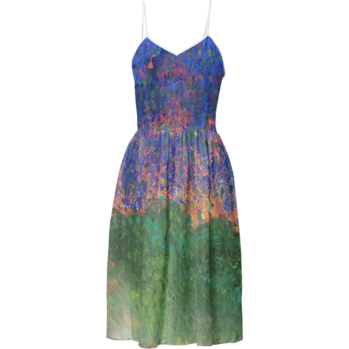 Knee length v-neckline dress with adjustable spaghetti straps shirred waist and invisible side seam zipper.