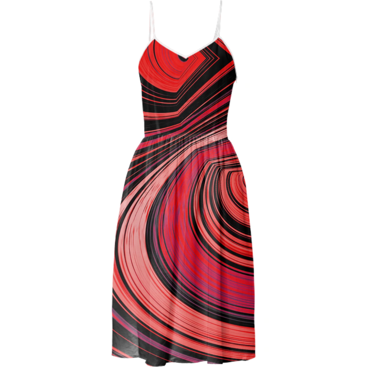 Knee length v-neckline dress with adjustable spaghetti straps shirred waist and invisible side seam zipper.
