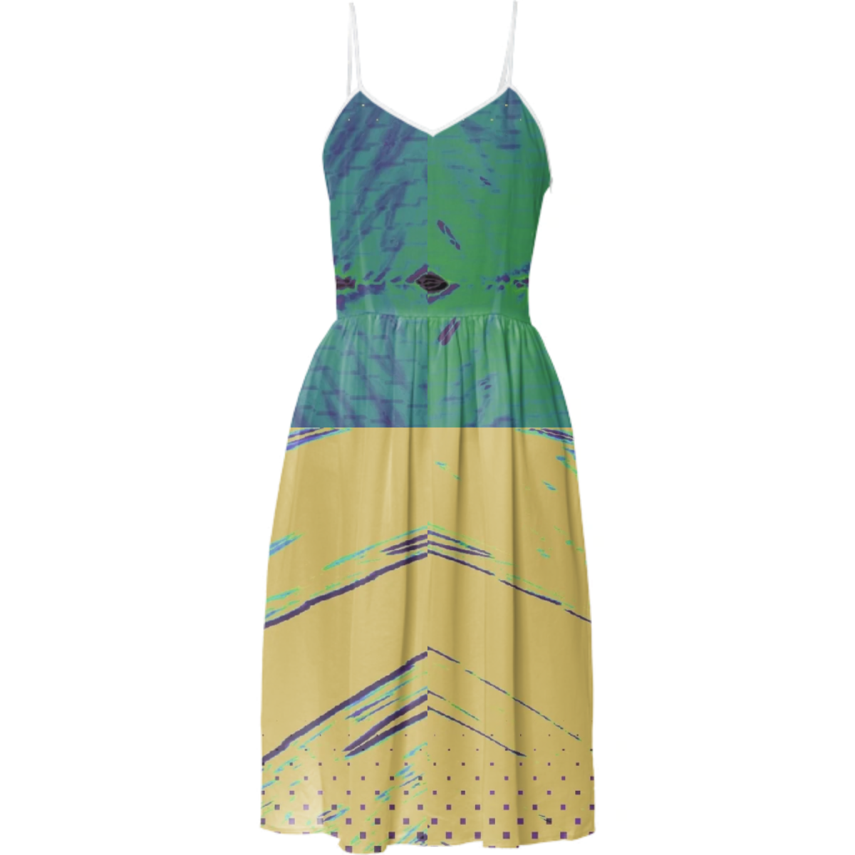 Knee length v-neckline dress with adjustable spaghetti straps shirred waist and invisible side seam zipper.