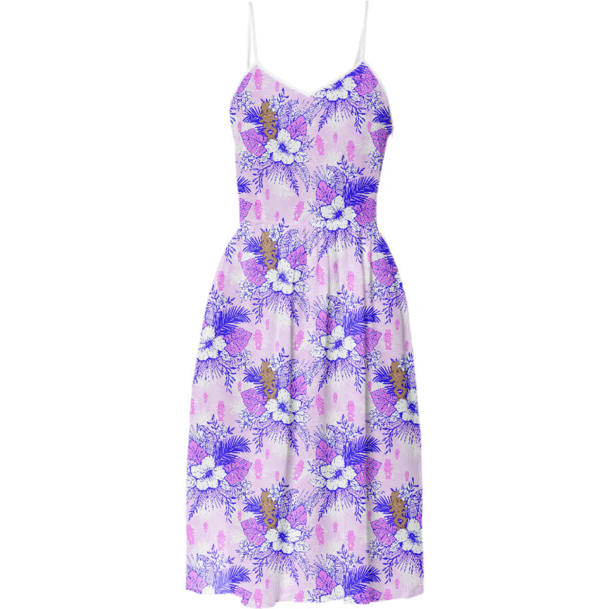 Knee length v-neckline dress with adjustable spaghetti straps shirred waist and invisible side seam zipper.