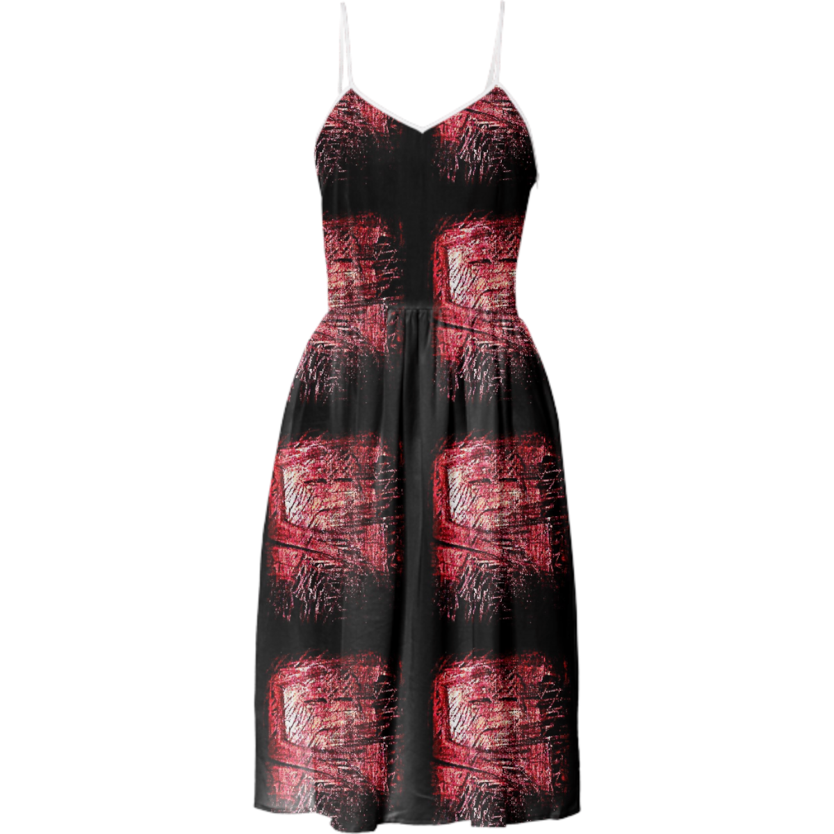 Knee length v-neckline dress with adjustable spaghetti straps shirred waist and invisible side seam zipper.