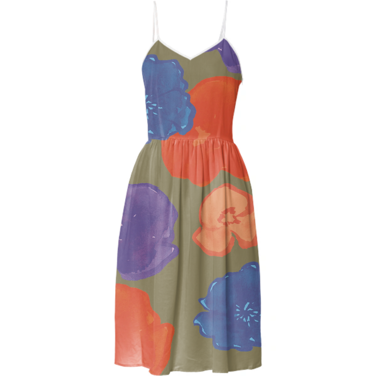 Knee length v-neckline dress with adjustable spaghetti straps shirred waist and invisible side seam zipper.
