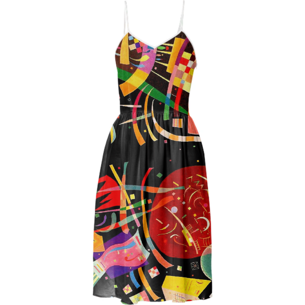 Knee length v-neckline dress with adjustable spaghetti straps shirred waist and invisible side seam zipper.