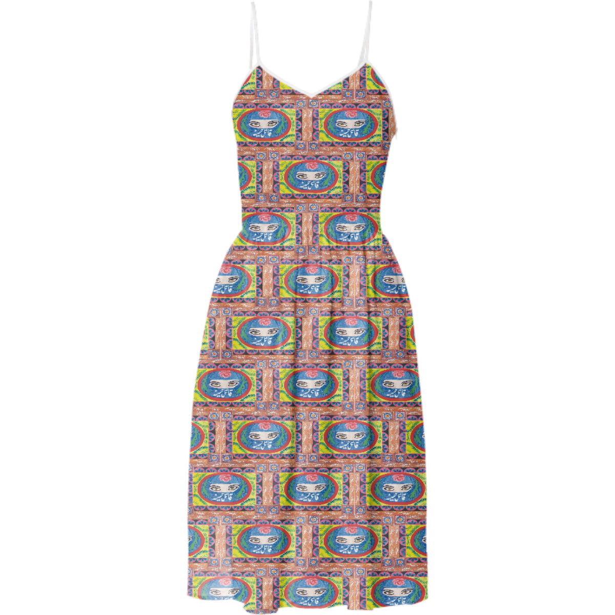 Knee length v-neckline dress with adjustable spaghetti straps shirred waist and invisible side seam zipper.